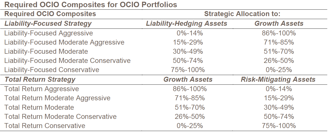 • The use of a Required OCIO Composite structure, with OCIO Portfolios assigned to composites based on strategic asset allocation
